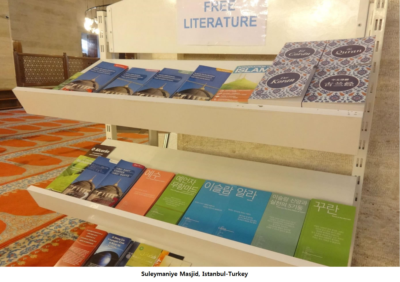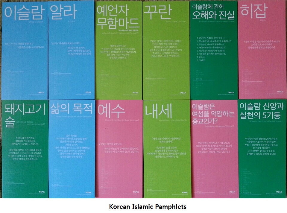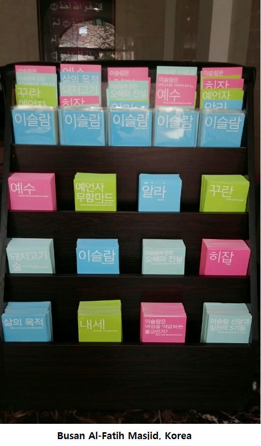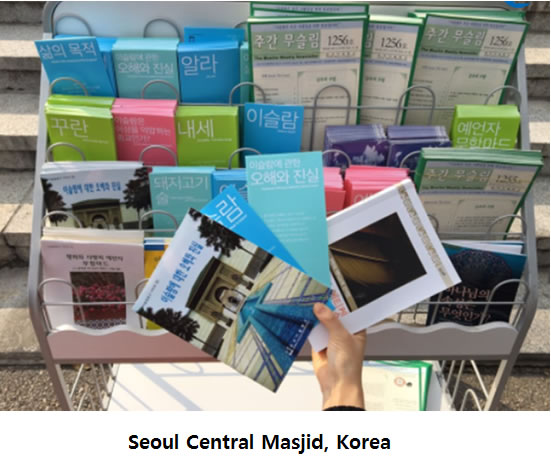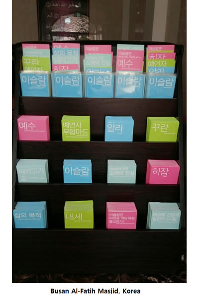İslami broşür setimiz Korede Seul Merkez Camisi, Busan Fetih Camisi ve İnçon İslam Kültür Merkezini ziyaret edenlere sunulmakta, Türkiyede ise Süleymaniye Camiini ziyaret eden Koreli turistlere verilmektedir.